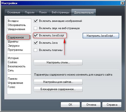 3. В меню слева выберите «Содержимое» и в окне справа установите галочку в поле «Включить JavaScript», нажмите на кнопку «ОК».