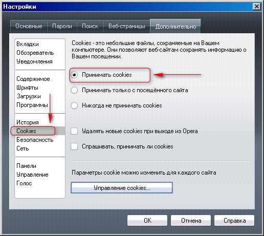 3. В меню слева выберите «Cookies» и в окне справа установите маркер в поле «Принимать cookies», нажмите на кнопку «ОК».