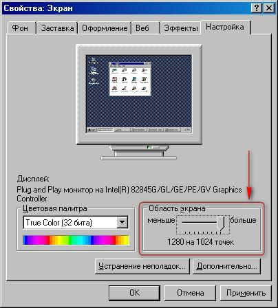 2. В открывшемся окне перейдите во вкладку «Настройка». При помощи ползунка в разделе «Область экрана» выставьте нужные нам цифры (1024х768 и больше) и нажмите кнопку «ОК».