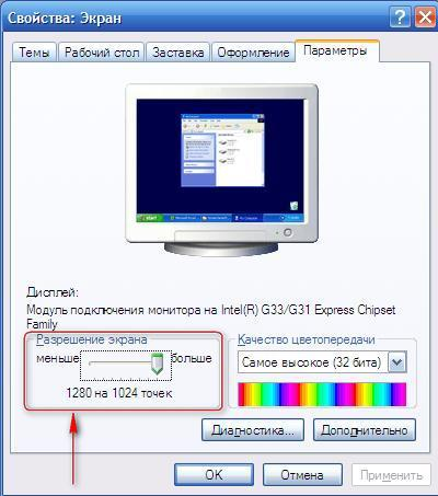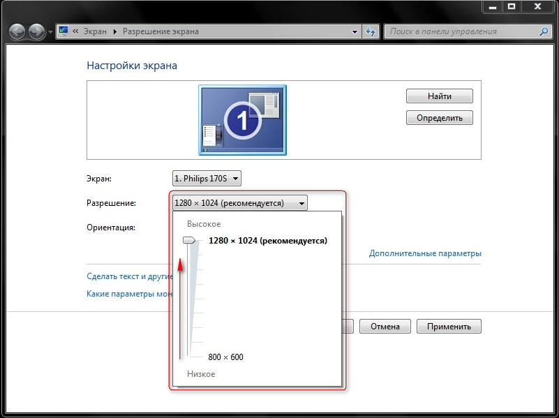 2. В открывшемся окне в разделе «Разрешение» щелкните мышкой по маленькому черному треугольнику и в появившемся окне при помощи ползунка выставьте нужные нам цифры (1024х768 и больше) и нажмите кнопку «ОК».